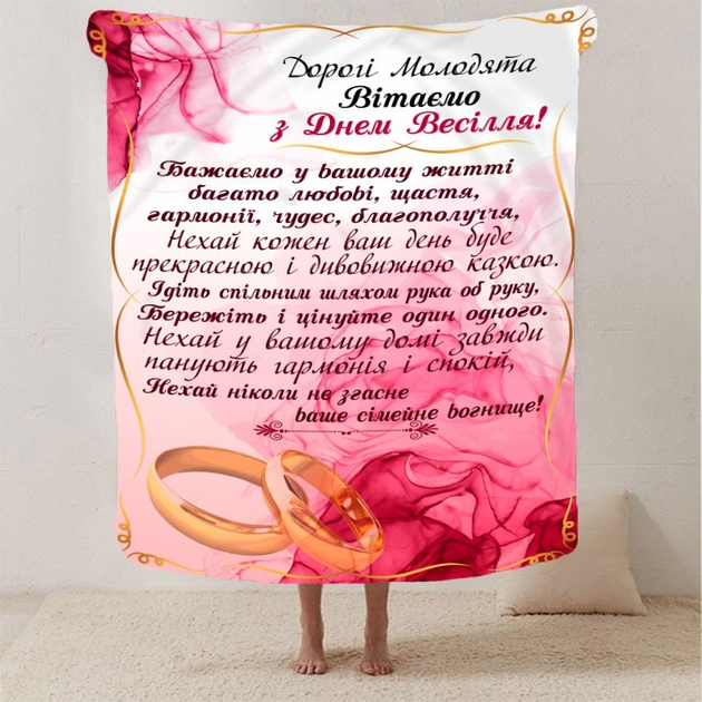 Плед покривало Полуторний з Побажаннями Весільні 160х200 Рожевий Плюш-велюр