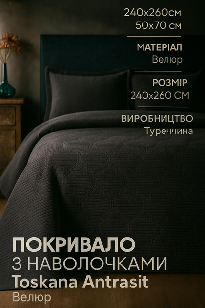 Покривало з наволочками Toskana Antrasit 240260 см, велюр, Туреччина, м’яке, елегантне, подарунковий комплект з 4 наволочкам