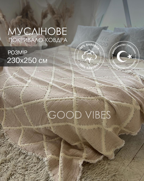 Муслінове покривало ковдра бавовняне двостороннє візерунок ромб бежевого кольору 230х250 см Moss Home (MUS005)