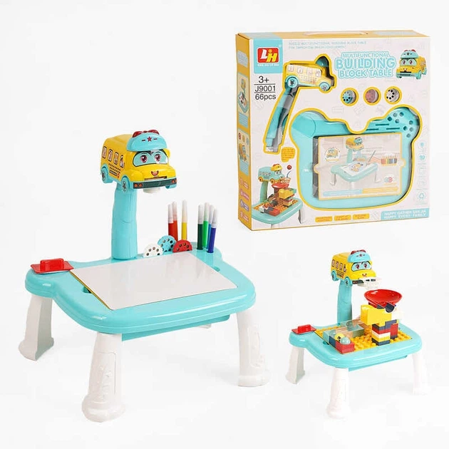 Столик з проєктором з багаторазовим малюванням (J 9001) 3 диски, фломастери, конструктор, гра з кулькою, альбом