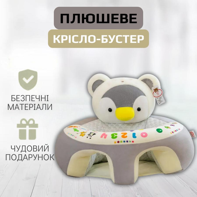 Дитяче плюшеве сидіння-бустер у вигляді тваринки м'яке крісло з бортиками пінгвін сірий (280038М)