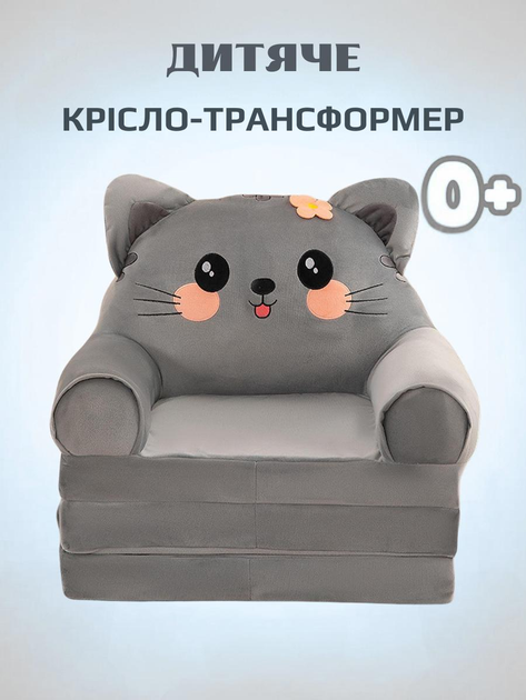 Плюшеве розкладне крісло-ліжко для дітей котик диванчик трансформер 2 в 1 сірий (280053М)
