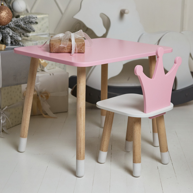 Дитячий прямокутний стіл і стільчик корона з білим сидінням. Столик рожевий дитячий