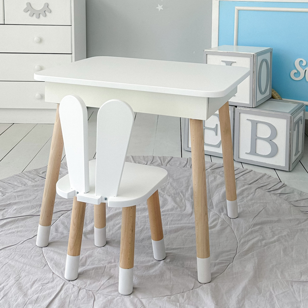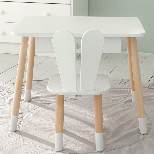 Дитячий прямокутний столик з висувним ящиком 46х60х45 і стільчик вушка зайки 26.5х26х25, стіл та стілець від 1 року, білий