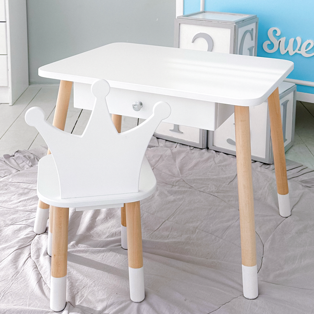 Дитячий столик із висувною шухлядою 46х60х45 і сидіння корона, стіл та стілець для дитячої кімнати, білосніжний