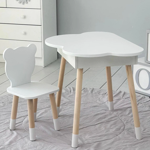 Стіл білий хмаринка з нішею і стільчик ведмедик, для розвитку, творчості, малювання та навчання, 65480