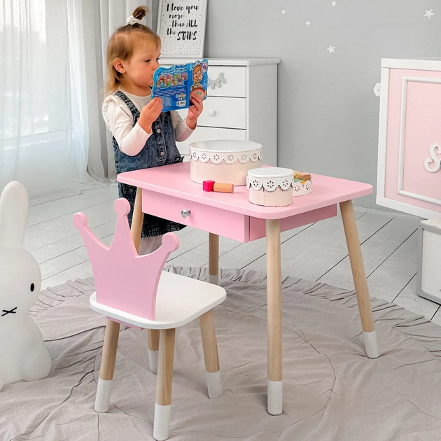 Дитячий столик з висувним ящиком 46х60х45 і стільчик корона 26.5х26х25, столик та стілець для дитини до 7 років, рожевий з б