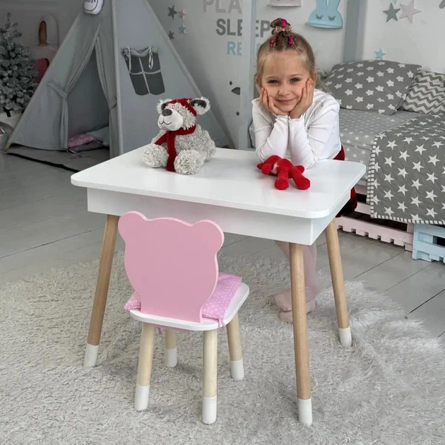 Дитячий столик білий і стільчик ведмедик рожево-білий. Столик із шухлядою для олівців і розмальовок 21441