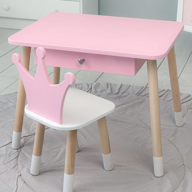 Дитячий столик з дерева 46х60х45 і стільчик корона 26.5х26х25, стіл та стілець для маленьких дітей, рожевий з білим