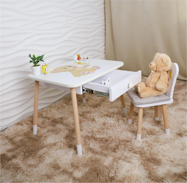 Стіл дитячий білий з висувним ящиком і стільцем—для кімнати,дитсадка або куточка творчості з малюнком ведведика
