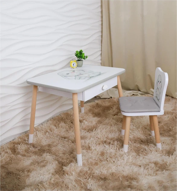Дитячий набір: стіл зі шухлядою для речей + стілець з подушкою для комфортного навчання з малюнком зайчика