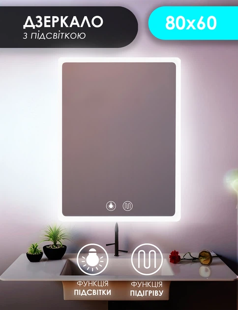 Дзеркало з підсвідкою 80х60 см дзеркало для ванної кімнати смарт настінне з підігрівом BRS