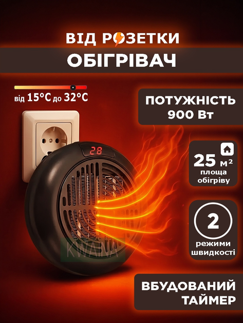 Портативний міні обігрівач в розетку, компактний електричний з терморегулятором та таймером, 900 Вт, чорний