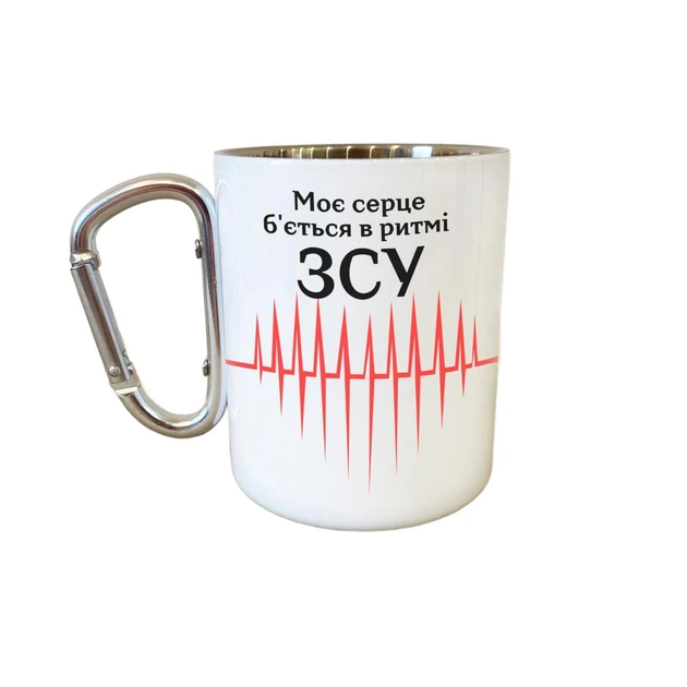 Кружка металева з карабіном Моє серце б'ється в ритмі ЗСУ 2 300 мл Біла