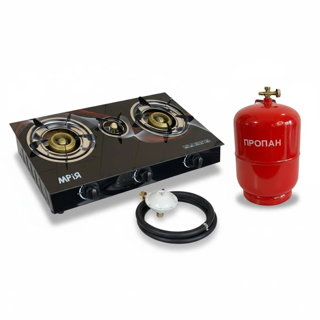 Газова плита-таганок настільна Мрія 3 конфорки Скло з балоном 12 л ( підключення 3м шланга, редуктор, хомути)