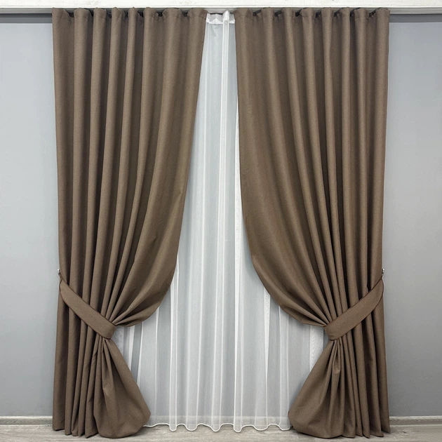 Комплект штор VR-Textil 100 блекаут ASHEN NIGHT 150х270 2шт і Тюль 400х270 1854ш-1153т коричневий з білим 71-094/3