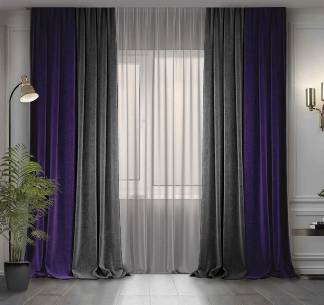 Комплект двоколірних штор Декор-Ін Мікровелюр 300x260 2 шт Темно-сірі з Темно-фіолетовим (ROZ6400067304)