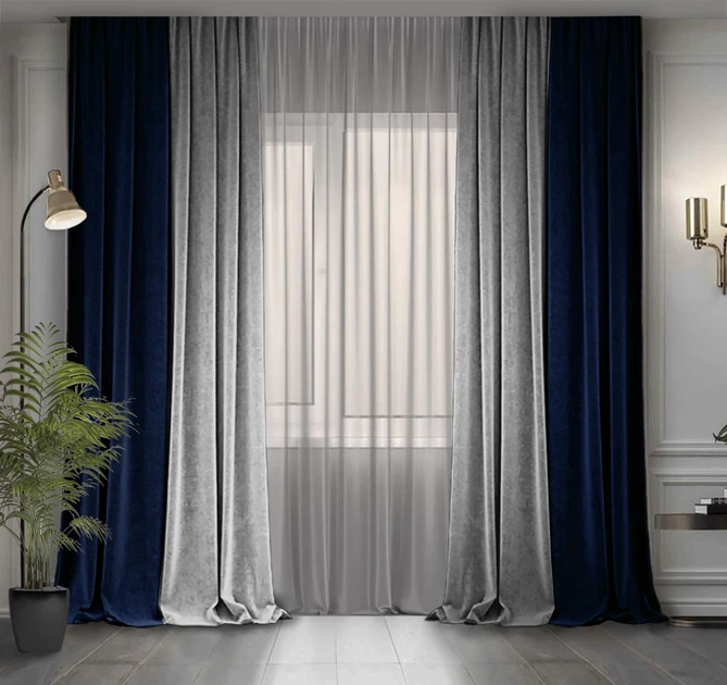 Комплект двоколірних штор Декор-Ін Мікровелюр 300x270 2 шт Світло-сірий з Темно-синім (ROZ6400066634)