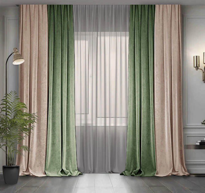 Комплект двоколірних штор Декор-Ін Мікровелюр 300x275 2 шт Бежевий з Оливкою (ROZ6400065432)