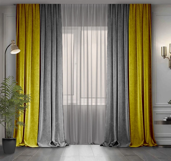 Комплект двоколірних штор Декор-Ін Мікровелюр 300x265 2 шт Сірі з Гірчично-жовтим (ROZ6400066801)