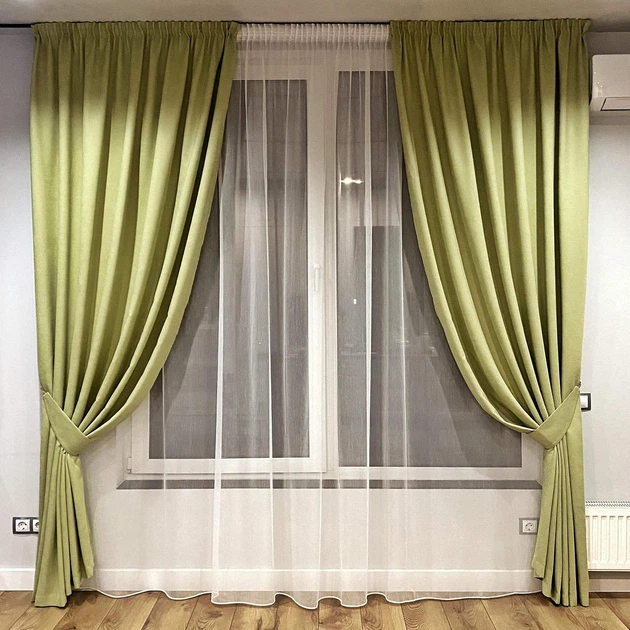 Комплект штори 2 шт. з підхватами 200х250 см мікровелюр Світло-зелений, тюль бамбук 700 см Тепло-білий