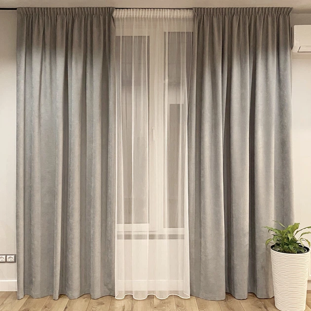 Комплект штори 2 шт 220х250 см мікровелюр Сірий, тюль бамбук 700 см Тепло-білий