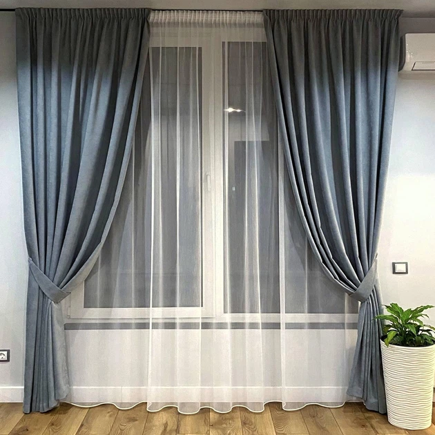 Комплект штори 2 шт. з підхватами 300х250 см мікровелюр Сіро-синій, тюль бамбук 750 см Тепло-білий