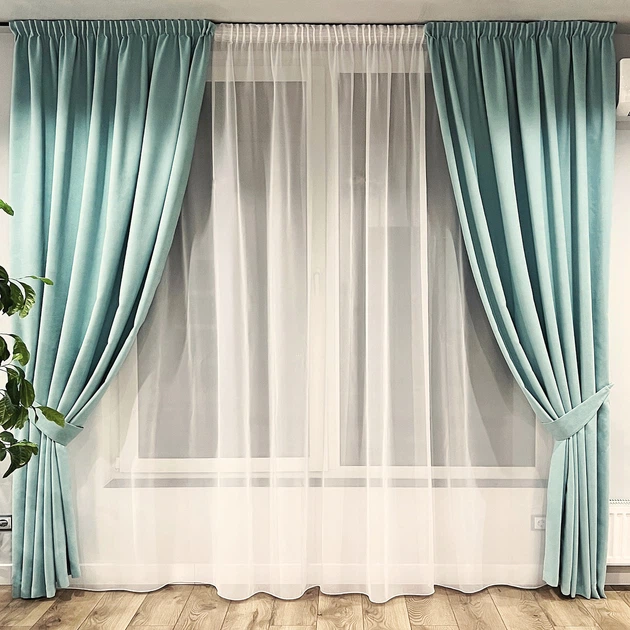 Комплект штори на тасьмі 2 шт з підхватами 220х250 см мікровелюр Світло-бірюзовий, вуаль 750 см Білий
