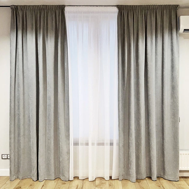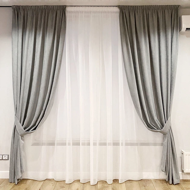 Комплект штори на тасьмі 2 шт з підхватами 250х250 см мікровелюр Сірий, вуаль 750 см Білий