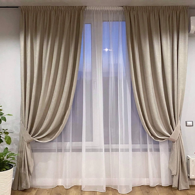 Комплект штори на тасьмі 2 шт з підхватами 250х250 см мікровелюр Беж-капучино, вуаль 750 см Білий
