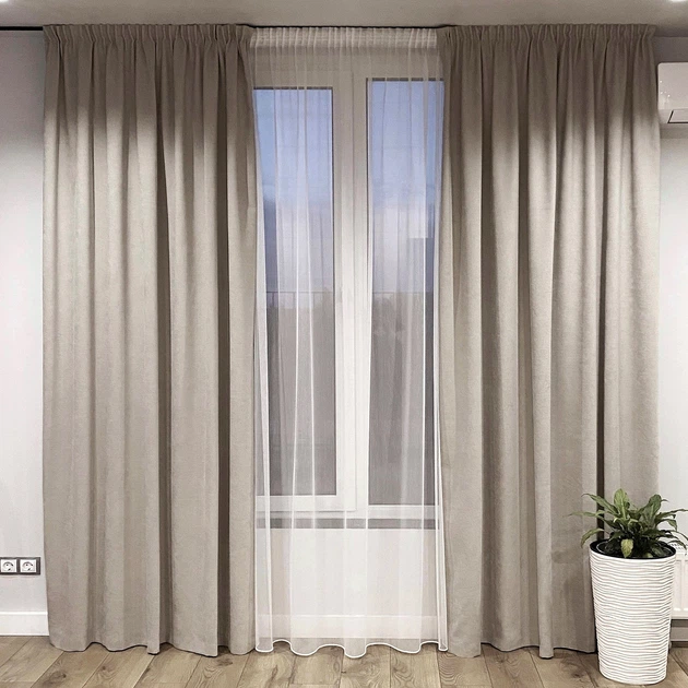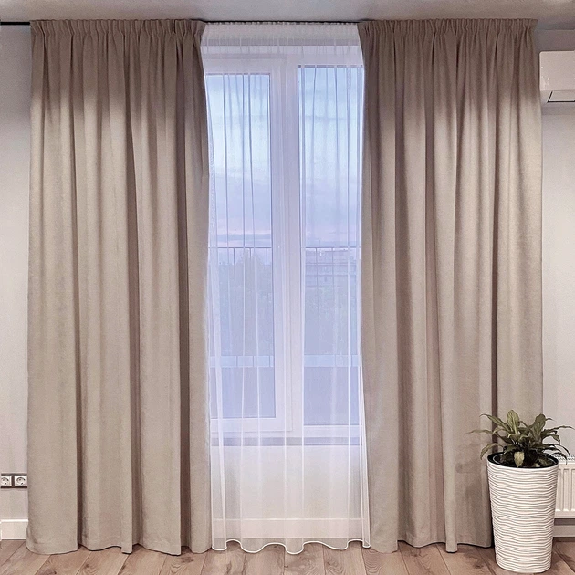 Комплект штори 2 шт 280х285 см мікровелюр Беж-капучино, тюль бамбук 750 см Тепло-білий