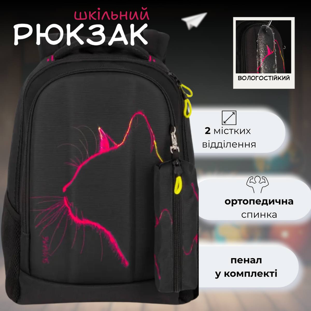 Шкільний рюкзак для підлітків, на 2 відділення, пенал у комплекті, принт Котик Winner One/SkyName