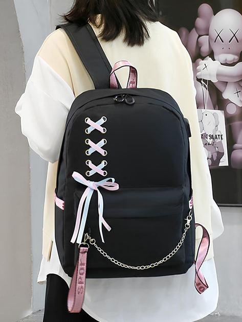 Шкільний рюкзак для дівчинки 45*32 см чорний водонепроникний з бантом і USB для дівчат підлітків у школу 5-11 клас і студент
