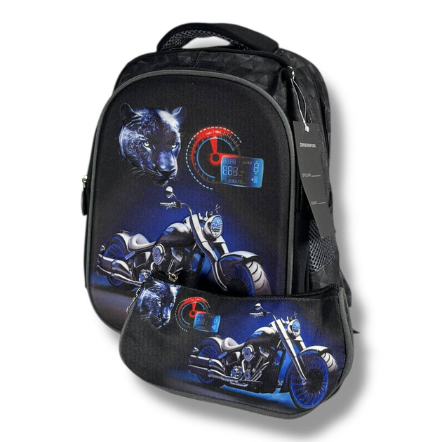 Шкільний рюкзак для хлопчиків 6–9 років, чорний, у комлекті з пеналом, принт Мотоцикл, на 3 відділення ZhiHuiShenTong