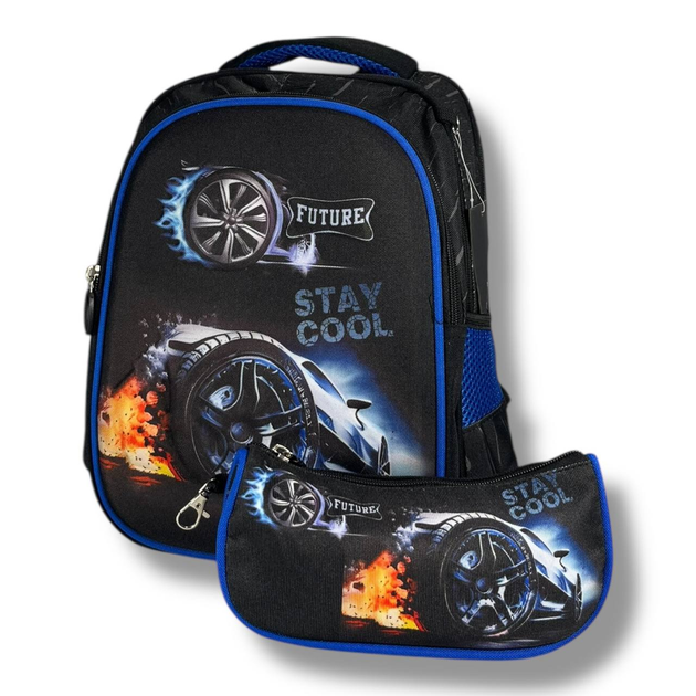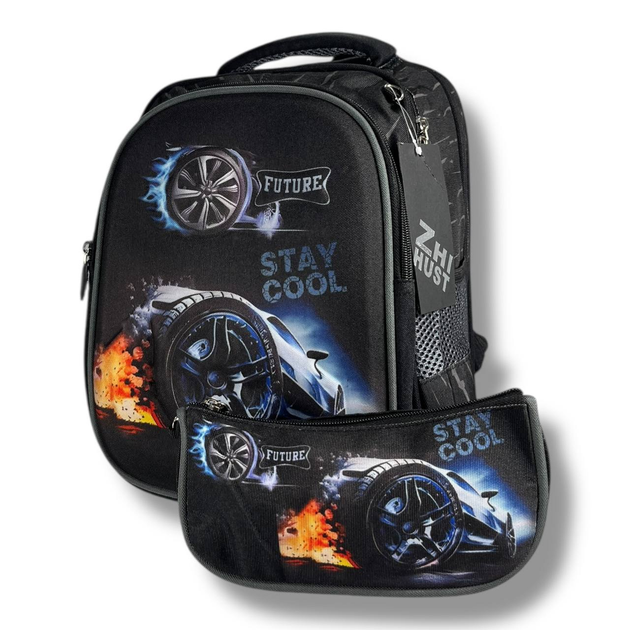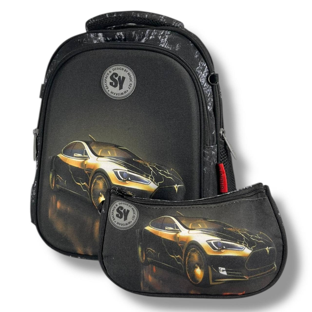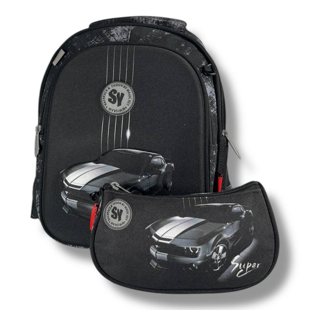 Шкільний рюкзак для хлопчиків 6–9 років, чорний, у комлекті з пеналом, принт Машинка ZhiHuiShenTong