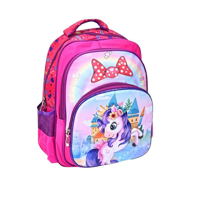 Дитячий рюкзак FG240502003A з двома відділеннями та зовнішньою кишенею, рожевий з принтом єдинорога