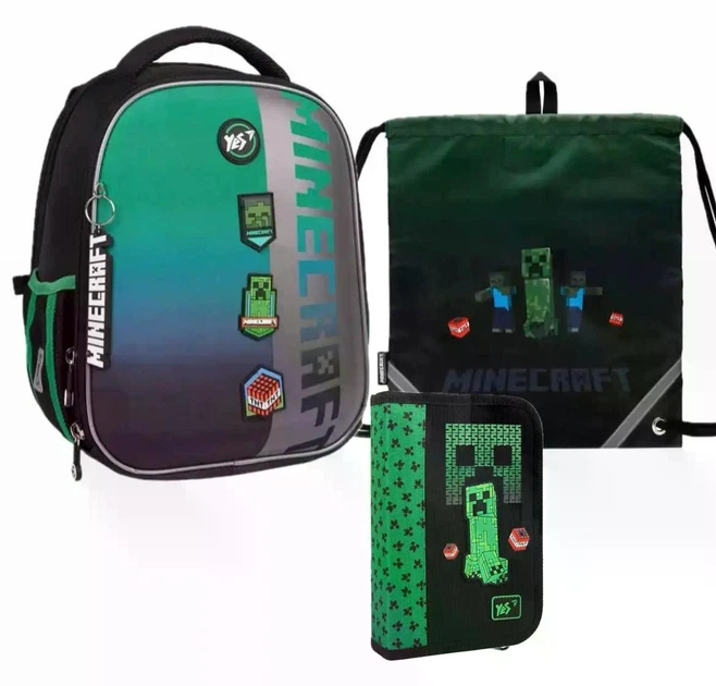 Рюкзак шкільний ортопедичний YES H-100 + пенал + сумка Minecraft Icons зелений 559861К