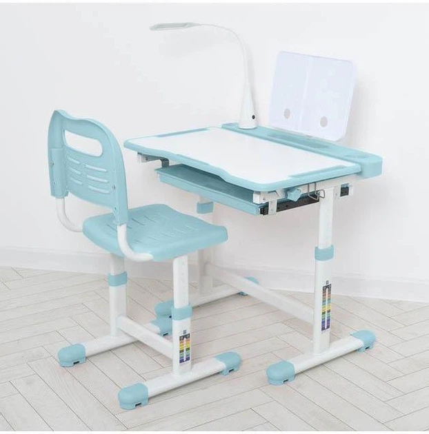 Дитяча парта одномісна зі стільчиком, регульована по висоті, оснащена лампою та зручною підставкою для книг Bambi біло-блаки