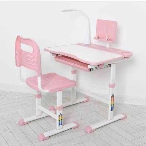 Дитяча парта одномісна зі стільчиком, регульована по висоті, оснащена лампою та зручною підставкою для книг Bambi біло-рожев
