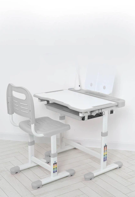 Дитяча парта одномісна зі стільчиком, регульована по висоті, оснащена лампою та зручною підставкою для книг Bambi біло-сірий