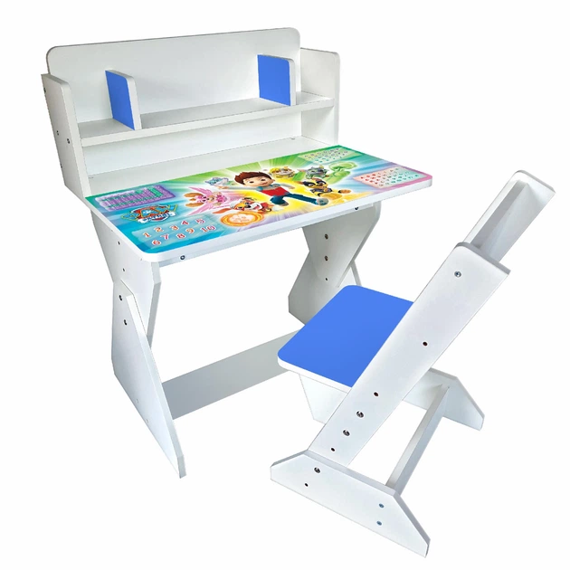 Дитяча парта зі стільчиком Українські янголята П02 з регулюванням висоти, біло-синій колір, малюнок Щенячий патруль