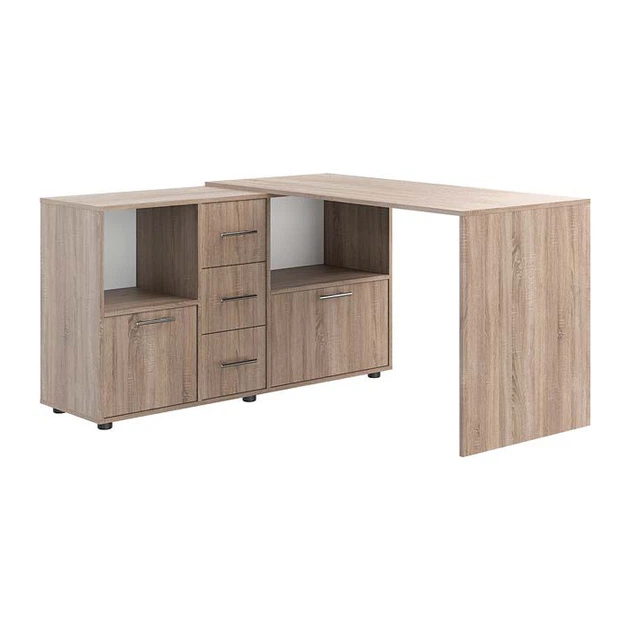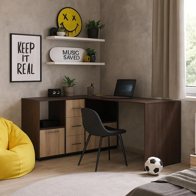 Стильний сучасний кутовий комп'ютерний письмовий стіл для пк та ноутбука із шухлядами і тумбами з відкритими полками у стилі
