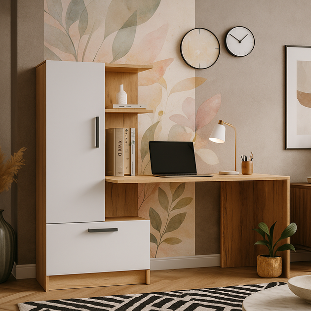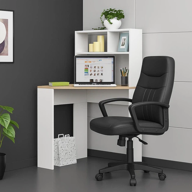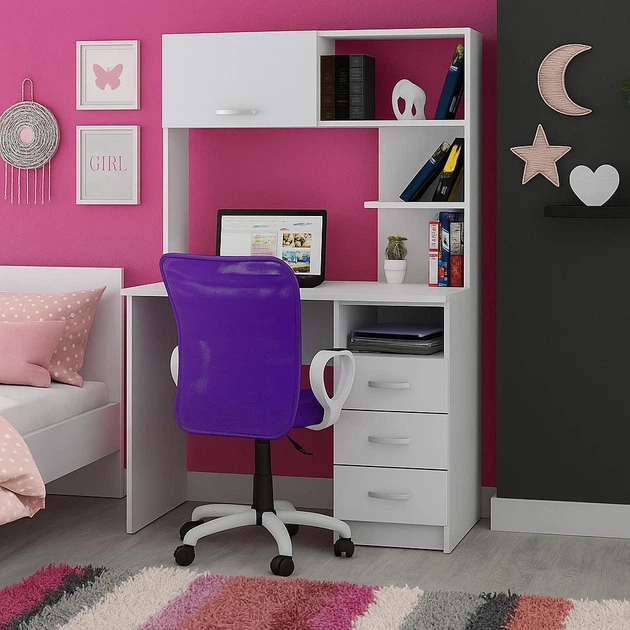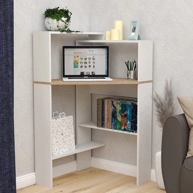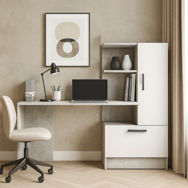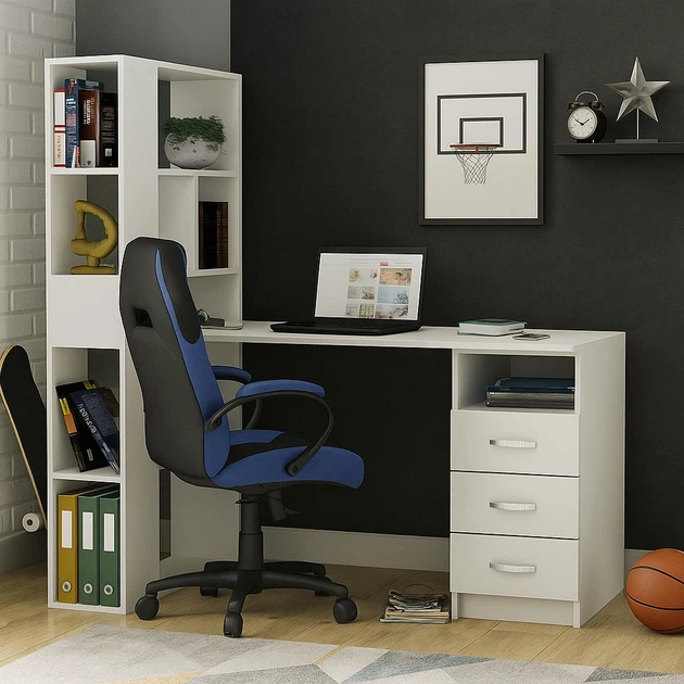 Маленький сучасний білий письмовий комп'ютерний стіл для ноутбука пк з надбудовою відкритими полками та тумбою з шухлядами 1