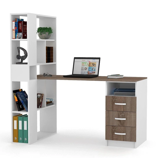 Великий сучасний білий письмовий комп'ютерний стіл для ноутбука зі стелажем з відкритими полками та тумбою з висувними шухля