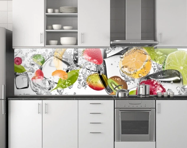 Кухонна панель жорстка ПЕТ вишні в кубиках льоду, з двостороннім скотчем 62 х 410 см, 1,2 мм (ПЭТ-sed588)