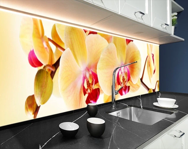 Панель на кухонний фартух під скло орхідеї жовті, з двостороннім скотчем 62 х 410 см, 1,2 мм (ПЭТ-sfl203)