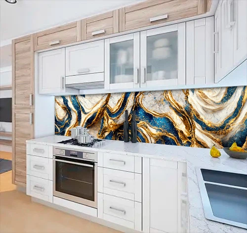 Кухонна панель жорстка ПЕТ мармур синій із золотом та білим, з двостороннім скотчем 62 х 410 см, 1,2 мм (ПЭТ-stx331)