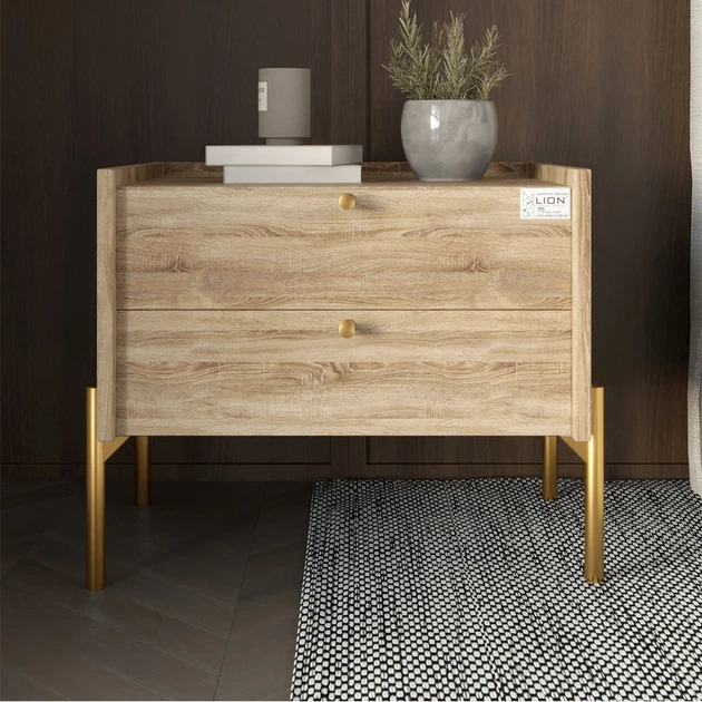 Тумба приліжкова LION Wood з двома шухлядами Дуб Сонома Трюфель (золоті ножки) (LION-041353)