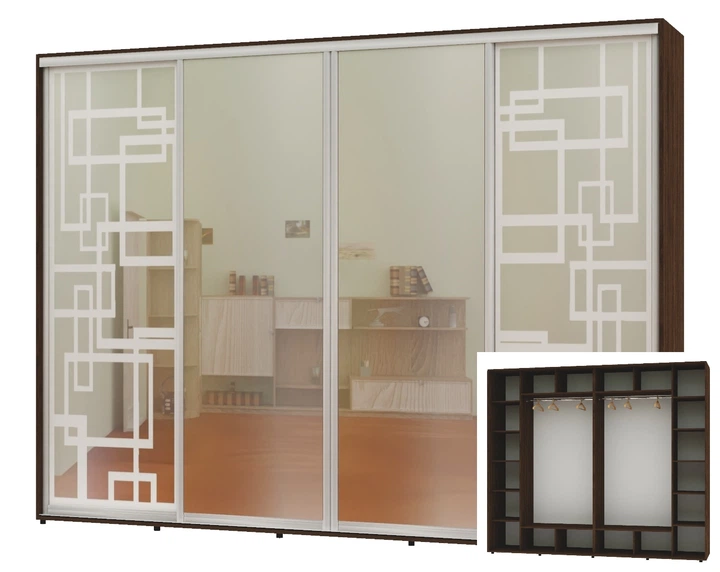 Шафа-купе чотиридверна Алекса 360*60*250 Горіх лісовий 2 Дзеркала з піскострумним малюнком/2 Дзеркала