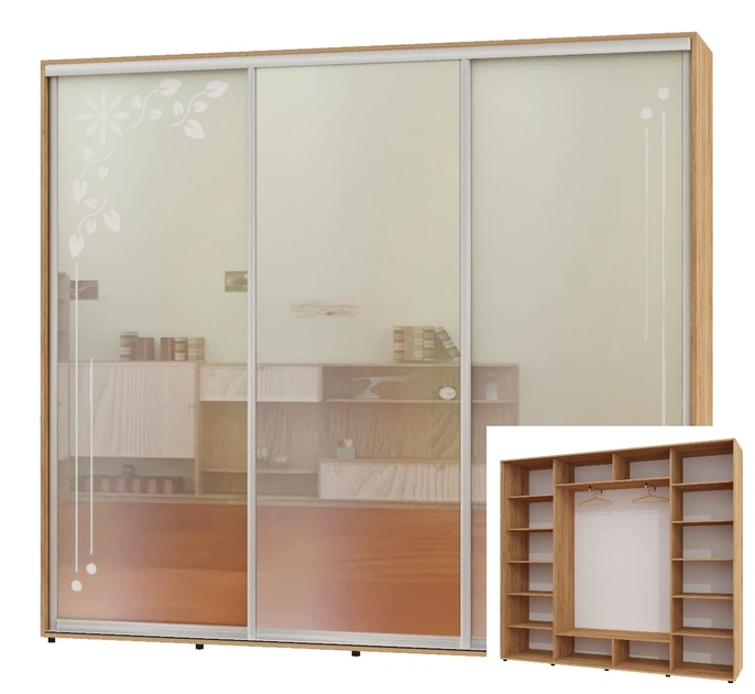 Шафа-купе тридверна Алекса 260*45*220 Дуб Сонома 2 Дзеркала з піскострумним малюнком/Дзеркало ШК-05